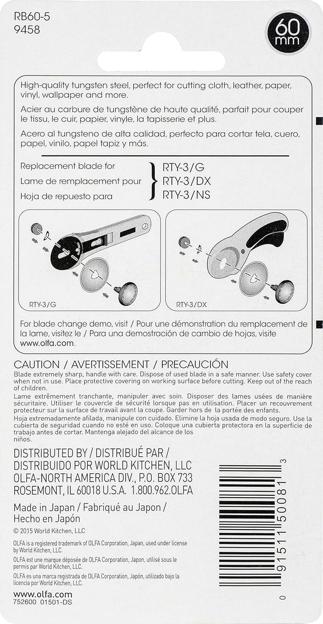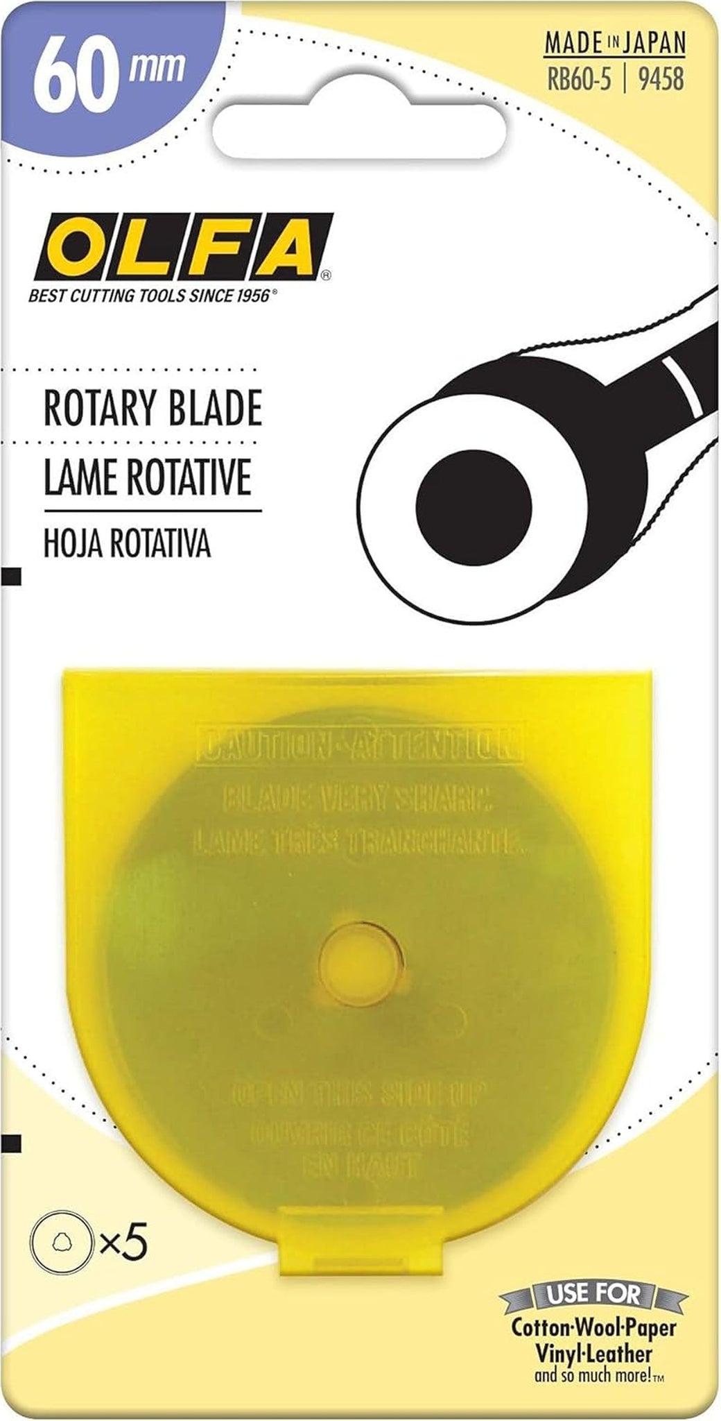 OLFA 60mm Rotary Cutter Replacement Blades, 5 Blades (RB60-5) - Tungsten Steel Circular Rotary Fabric Cutter Blade for Crafts, Sewing, Quilting, Fits Most 60mm Rotary Cutters
